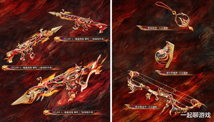 作为全新的璀璨转盘之一,哪吒系列其他皮肤也是相当出彩。首先我们来点评一下枪皮,此次出现的是碎片手雷、燃点复合弓以及9级ScarL,光子加入了大量的哪吒火尖枪元素,整体看起来可以说是相当炫酷。